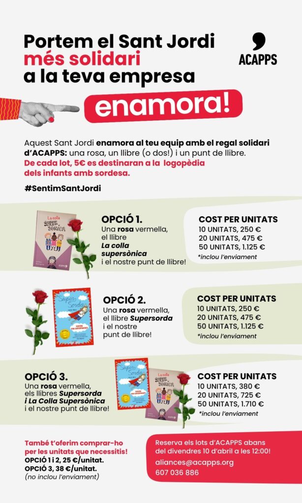 Portem Sant Jordi a les empreses! A ACAPPS hem preparat lots solidaris amb els llibres La colla Supersònica i SuperSorda, una rosa i un punt de llibre personalitzat amb el nom de l’empresa.